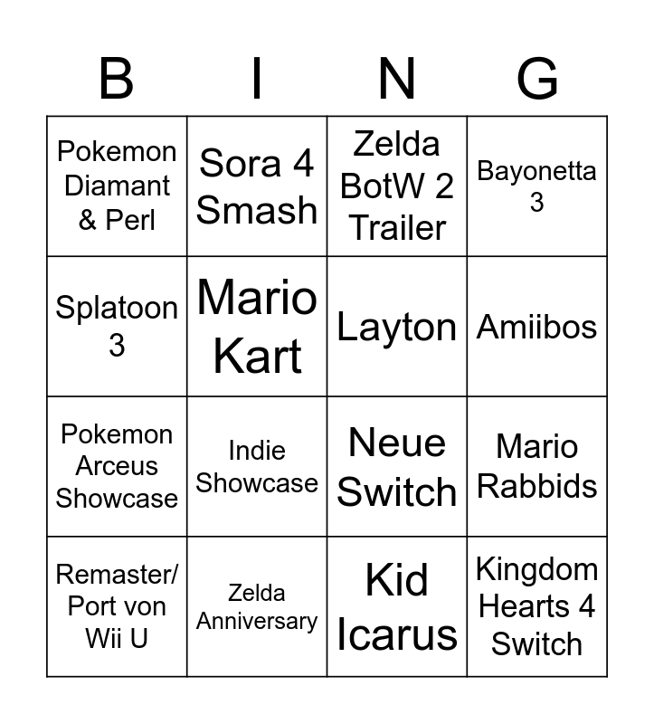 This bingo card has 16 words: Zelda Anniversary, Mario Rabbids, Zelda BotW 2 Trailer, Pokemon Diamant & Perl, Pokemon Arceus Showcase, Sora 4 Smash, Neue Switch, Kid Icarus, Splatoon 3, Mario Kart, Remaster/ Port von Wii U, Bayonetta 3, Indie Showcase, Amiibos, Layton and Kingdom Hearts 4 Switch.