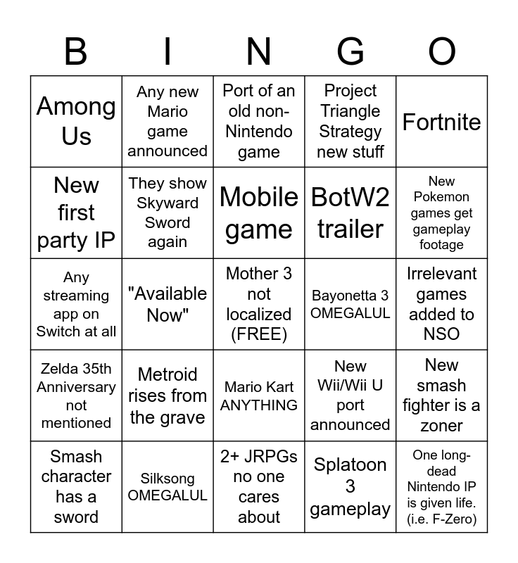 This bingo card has a free space and 29 words: Smash character has a sword, They show Mario Golf even though it releases next week, "Available Now", "But wait, we've got one more thing", Among Us, Port of an old non-Nintendo game, They show Skyward Sword again, Metroid rises from the grave, Bayonetta 3 OMEGALUL, Silksong OMEGALUL, Irrelevant games added to NSO, One long-dead Nintendo IP is given life. (i.e. F-Zero), 2+ JRPGs no one cares about, Splatoon 3 gameplay, New Pokemon games get gameplay footage, New major title we didn't already know about, Mario Kart ANYTHING, Zelda 35th Anniversary not mentioned, Fortnite, Any streaming app on Switch at all, New Wii/Wii U port announced, Weird artsy indie game, BotW2 trailer, New first party IP, Project Triangle Strategy new stuff, Any new Mario game announced, New smash fighter is a zoner, Mobile game and Meme Mii fighter costume.
