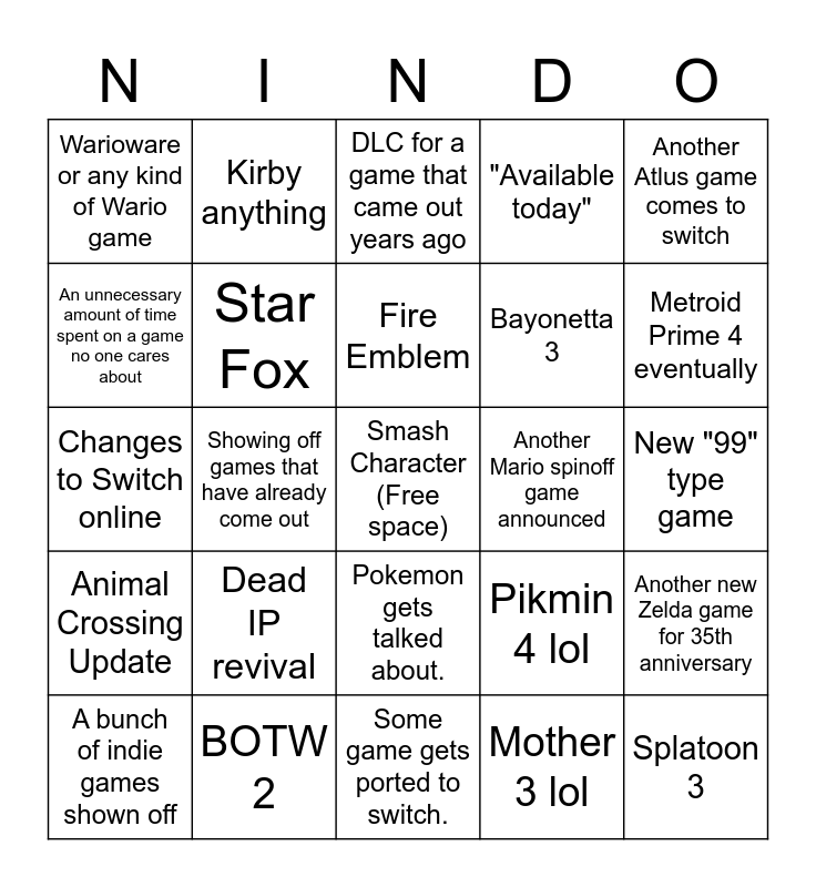 This bingo card has a free space and 24 words: Dead IP revival, BOTW 2, Fire Emblem, A bunch of indie games shown off, Another Atlus game comes to switch, Warioware or any kind of Wario game, An unnecessary amount of time spent on a game no one cares about, Kirby anything, Another Mario spinoff game announced, Pokemon gets talked about., Bayonetta 3, Changes to Switch online, Pikmin 4 lol, Another new Zelda game for 35th anniversary, Star Fox, Mother 3 lol, New "99" type game, DLC for a game that came out years ago, Metroid Prime 4 eventually, Showing off games that have already come out, Splatoon 3, Animal Crossing Update, "Available today" and Some game gets ported to switch..