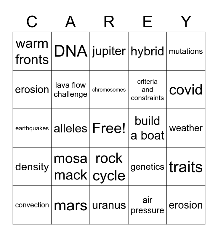 This bingo card has a free space and 29 words: convection, Pangea, alleles, plate tectonics, warm fronts, jupiter, lava flow challenge, mosa mack, build a boat, mars, weather, erosion, uranus, air pressure, covid, cold front, rock cycle, density, mutations, earthquakes, genetics, ocean currents, criteria and constraints, erosion, hybrid, DNA, traits, chromosomes and zoom.