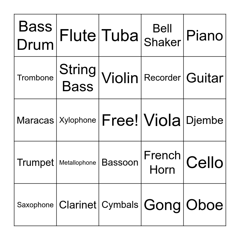 This bingo card has a free space and 24 words: Metallophone, Clarinet, Violin, Saxophone, Piano, Bass Drum, Trombone, Flute, Viola, Bassoon, Recorder, Maracas, French Horn, Cello, String Bass, Gong, Djembe, Tuba, Guitar, Xylophone, Oboe, Trumpet, Bell Shaker and Cymbals.