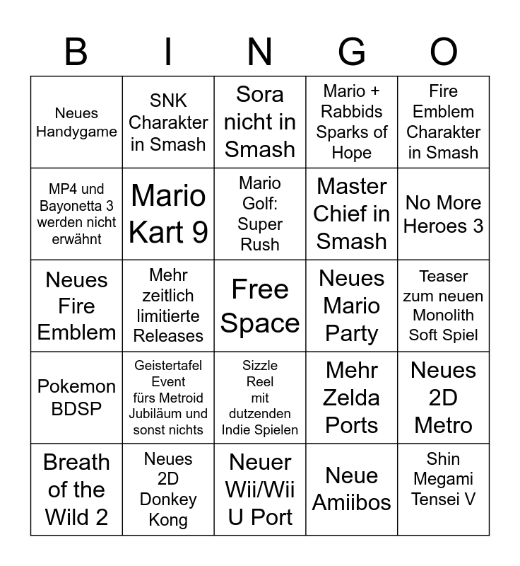 This bingo card has a free space and 24 words: Geistertafel Event fürs Metroid Jubiläum und sonst nichts, Neues 2D Donkey Kong, Mario Golf: Super Rush, Breath of the Wild 2, Fire Emblem Charakter in Smash, Neues Handygame, MP4 und Bayonetta 3 werden nicht erwähnt, SNK Charakter in Smash, Neues Mario Party, Sizzle Reel mit dutzenden Indie Spielen, Master Chief in Smash, Neues Fire Emblem, Mehr Zelda Ports, Neues 2D Metro, Mario Kart 9, Neue Amiibos, Teaser zum neuen Monolith Soft Spiel, Sora nicht in Smash, No More Heroes 3, Mehr zeitlich limitierte Releases, Shin Megami Tensei V, Pokemon BDSP, Mario + Rabbids Sparks of Hope and Neuer Wii/Wii U Port.