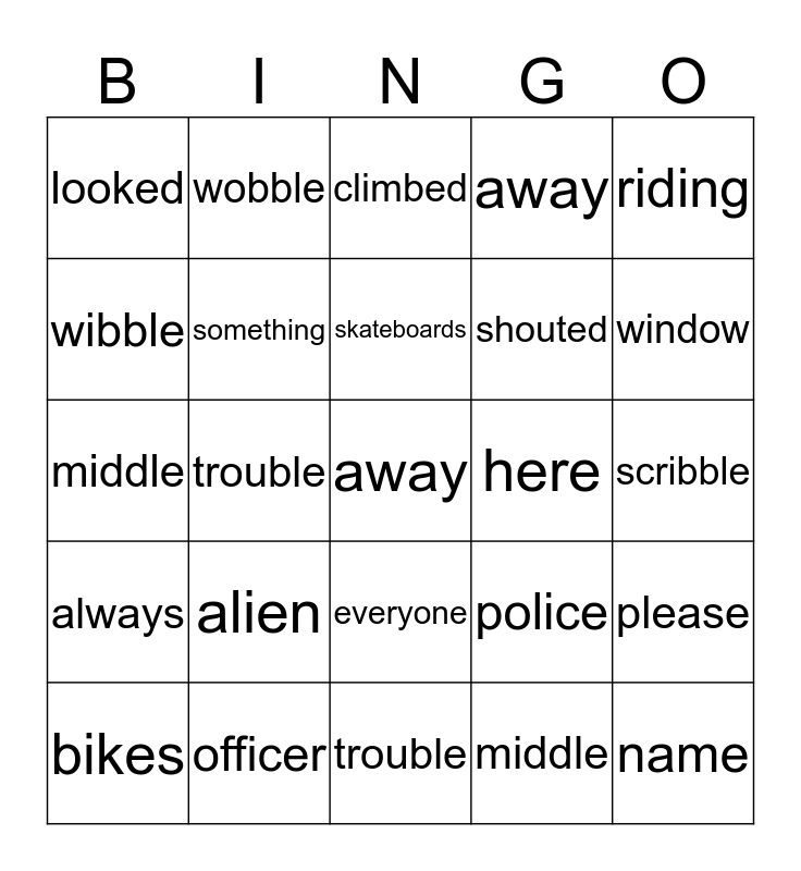 This bingo card has 25 words: alien, trouble, skateboards, bikes, riding, looked, wibble, wobble, here, everyone, shouted, middle, police, please, something, name, scribble, climbed, window, trouble, away, officer, always, away and middle.