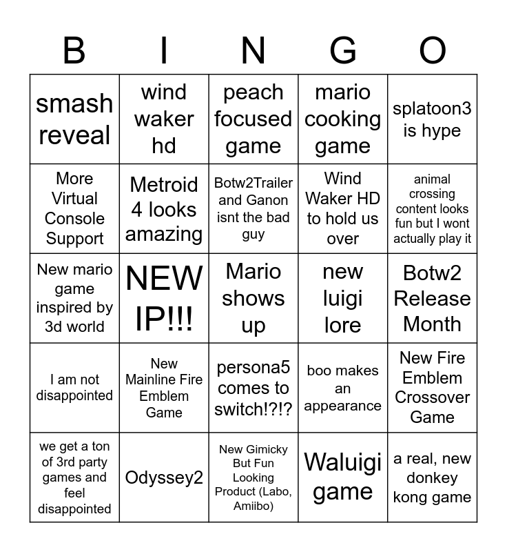 This bingo card has a free space and 24 words: New Mainline Fire Emblem Game, Odyssey2, Botw2Trailer and Ganon isnt the bad guy, we get a ton of 3rd party games and feel disappointed, splatoon3 is hype, smash reveal, More Virtual Console Support, wind waker hd, new luigi lore, persona5 comes to switch!?!?, Wind Waker HD to hold us over, New mario game inspired by 3d world, boo makes an appearance, New Fire Emblem Crossover Game, Metroid 4 looks amazing, Waluigi game, Botw2 Release Month, peach focused game, animal crossing content looks fun but I wont actually play it, NEW IP!!!, a real, new donkey kong game, I am not disappointed, mario cooking game and New Gimicky But Fun Looking Product (Labo, Amiibo).