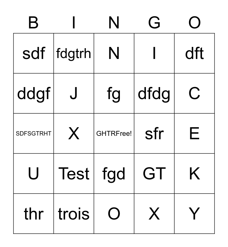 This bingo card has a free space and 24 words: Test, trois, fg, thr, dft, sdf, ddgf, fdgtrh, sfr, fgd, dfdg, SDFSGTRHT, GT, K, J, X, E, N, C, X, Y, U, I and O.