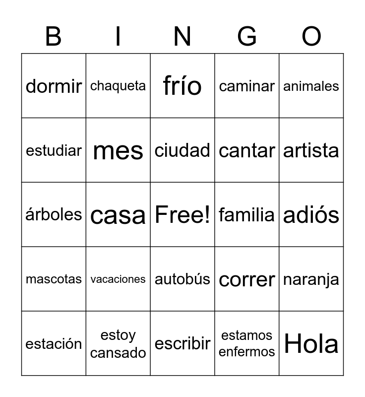 This bingo card has a free space and 39 words: hablar, día, semana, mes, estación, autobús, ciudad, campo, animales, mascotas, casa, caminar, Hola, adiós, familia, vacaciones, deportes, dormir, jugar a los videojuegos, correr, estudiar, escribir, cantar, artista, rojo, veinte, doscientos, cuatro, dormitorio, chaqueta, cara, ojos, frío, estoy cansado, estamos enfermos, manzana verde, naranja, árboles and hermanos.