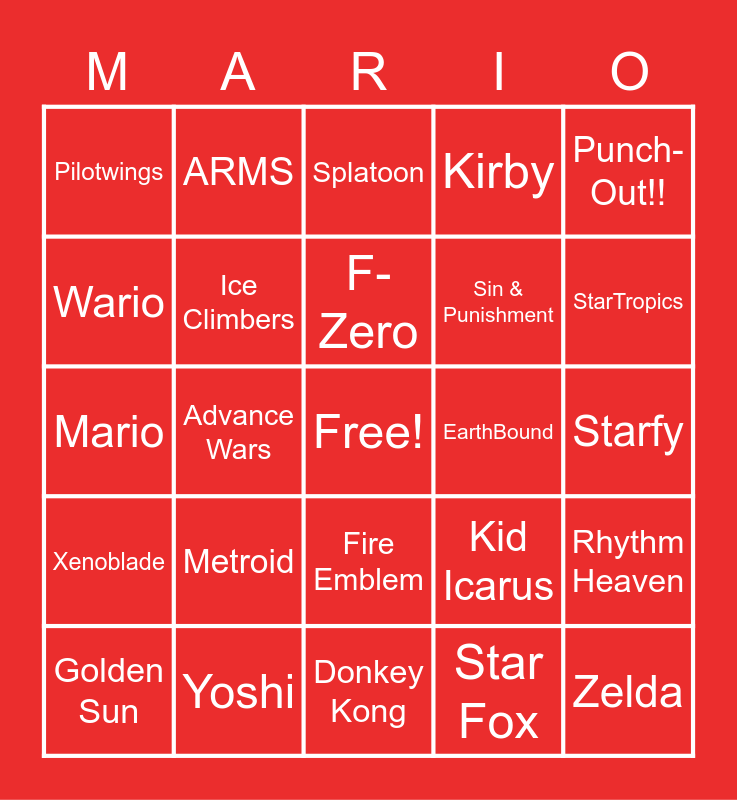 This bingo card has a free space and 24 words: Metroid, Yoshi, F-Zero, Golden Sun, Punch-Out!!, Pilotwings, Wario, ARMS, EarthBound, Fire Emblem, Sin & Punishment, Mario, Kid Icarus, Rhythm Heaven, Ice Climbers, Star Fox, Starfy, Splatoon, StarTropics, Advance Wars, Zelda, Xenoblade, Kirby and Donkey Kong.