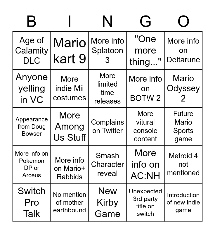 This bingo card has a free space and 24 words: More info on Mario+ Rabbids, No mention of mother earthbound, More limited time releases, Switch Pro Talk, More info on Deltarune, Age of Calamity DLC, Anyone yelling in VC, Mario kart 9, More vitural console content, Smash Character reveal, More info on BOTW 2, Appearance from Doug Bowser, More info on AC:NH, Metroid 4 not mentioned, More indie Mii costumes, Unexpected 3rd party title on switch, Future Mario Sports game, More info Splatoon 3, Mario Odyssey 2, More Among Us Stuff, Introduction of new indie game, More info on Pokemon DP or Arceus, "One more thing..." and New Kirby Game.