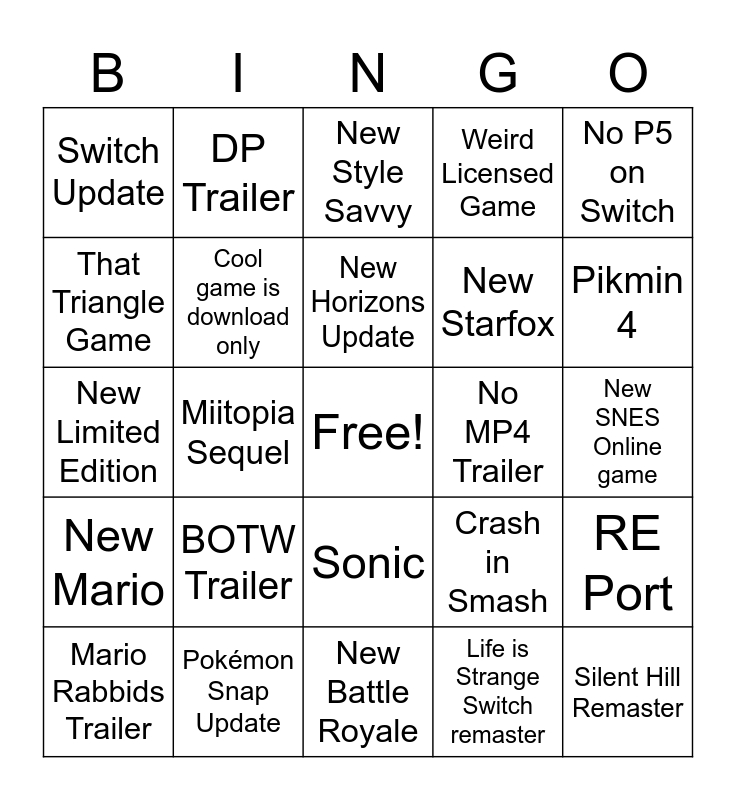 This bingo card has a free space and 24 words: BOTW Trailer, Pokémon Snap Update, New Horizons Update, Mario Rabbids Trailer, No P5 on Switch, Switch Update, That Triangle Game, DP Trailer, No MP4 Trailer, Sonic, New Starfox, New Limited Edition, Crash in Smash, RE Port, Cool game is download only, Life is Strange Switch remaster, New SNES Online game, New Style Savvy, Pikmin 4, Miitopia Sequel, Silent Hill Remaster, New Mario, Weird Licensed Game and New Battle Royale.