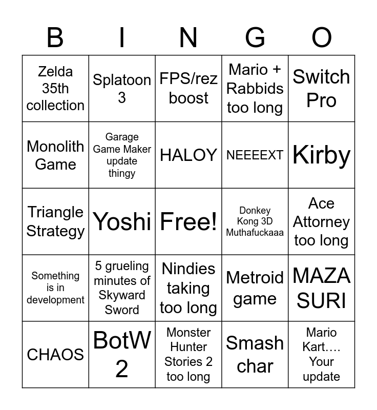 This bingo card has a free space and 24 words: 5 grueling minutes of Skyward Sword, BotW 2, HALOY, CHAOS, Switch Pro, Zelda 35th collection, Monolith Game, Splatoon 3, Donkey Kong 3D Muthafuckaaa, Nindies taking too long, NEEEEXT, Triangle Strategy, Metroid game, MAZA SURI, Garage Game Maker update thingy, Smash char, Ace Attorney too long, FPS/rez boost, Kirby, Yoshi, Mario Kart…. Your update, Something is in development, Mario + Rabbids too long and Monster Hunter Stories 2 too long.