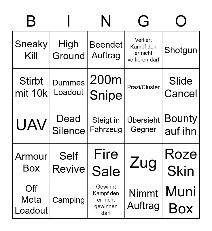 This bingo card has a free space and 24 words: Self Revive, Camping, 200m Snipe, Off Meta Loadout, Shotgun, Sneaky Kill, Stirbt mit 10k, High Ground, Übersieht Gegner, Fire Sale, Präzi/Cluster, UAV, Zug, Roze Skin, Dummes Loadout, Nimmt Auftrag, Bounty auf ihn, Beendet Auftrag, Slide Cancel, Dead Silence, Muni Box, Armour Box, Verliert Kampf den er nicht verlieren darf and Gewinnt Kampf den er nicht gewinnen darf.