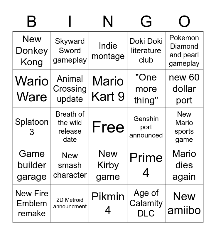This bingo card has a free space and 24 words: New smash character, 2D Metroid announcment, Mario Kart 9, New Fire Emblem remake, Pokemon Diamond and pearl gameplay, New Donkey Kong, Wario Ware, Skyward Sword gameplay, Genshin port announced, New Kirby game, "One more thing", Splatoon 3, Prime 4, Mario dies again, Animal Crossing update, Age of Calamity DLC, New Mario sports game, Indie montage, new 60 dollar port, Breath of the wild release date, New amiibo, Game builder garage, Doki Doki literature club and Pikmin 4.