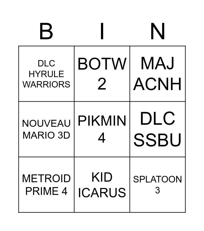 This bingo card has a free space and 8 words: DLC SSBU, MAJ ACNH, BOTW 2, METROID PRIME 4, DLC HYRULE WARRIORS, SPLATOON 3, NOUVEAU MARIO 3D and KID ICARUS.