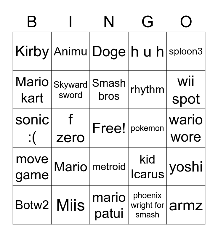 This bingo card has a free space and 24 words: Mario, Miis, Smash bros, Botw2, sploon3, Kirby, Mario kart, Animu, pokemon, metroid, rhythm, sonic :(, kid Icarus, yoshi, Skyward sword, phoenix wright for smash, wario wore, Doge, wii spot, f zero, armz, move game, h u h and mario patui.