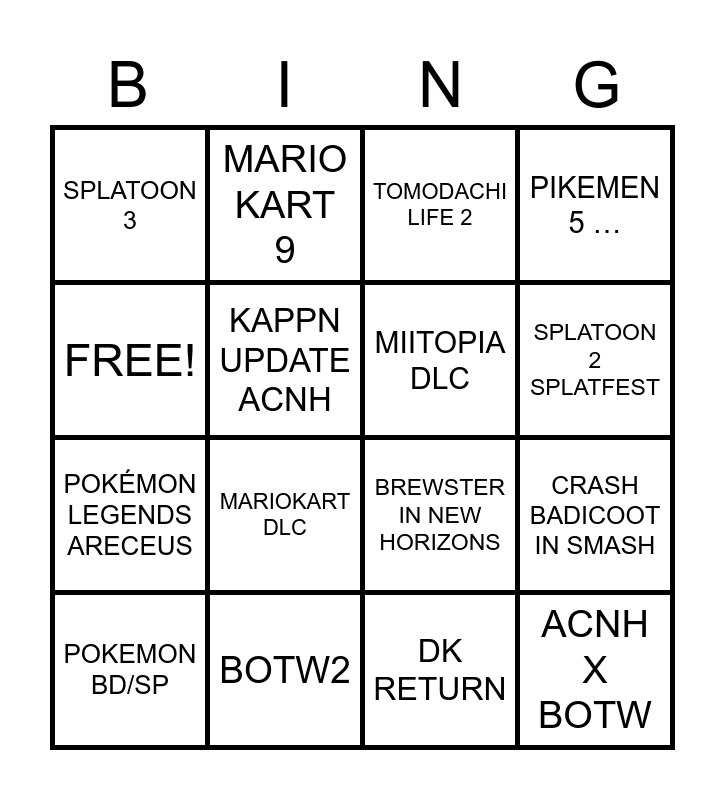 This bingo card has 16 words: BOTW2, CRASH BADICOOT IN SMASH, TOMODACHI LIFE 2, SPLATOON 3, POKÉMON LEGENDS ARECEUS, MARIO KART 9, BREWSTER IN NEW HORIZONS, DK RETURN, FREE!, KAPPN UPDATE ACNH, POKEMON BD/SP, PIKEMEN 5 …, MARIOKART DLC, SPLATOON 2 SPLATFEST, MIITOPIA DLC and ACNH X BOTW.