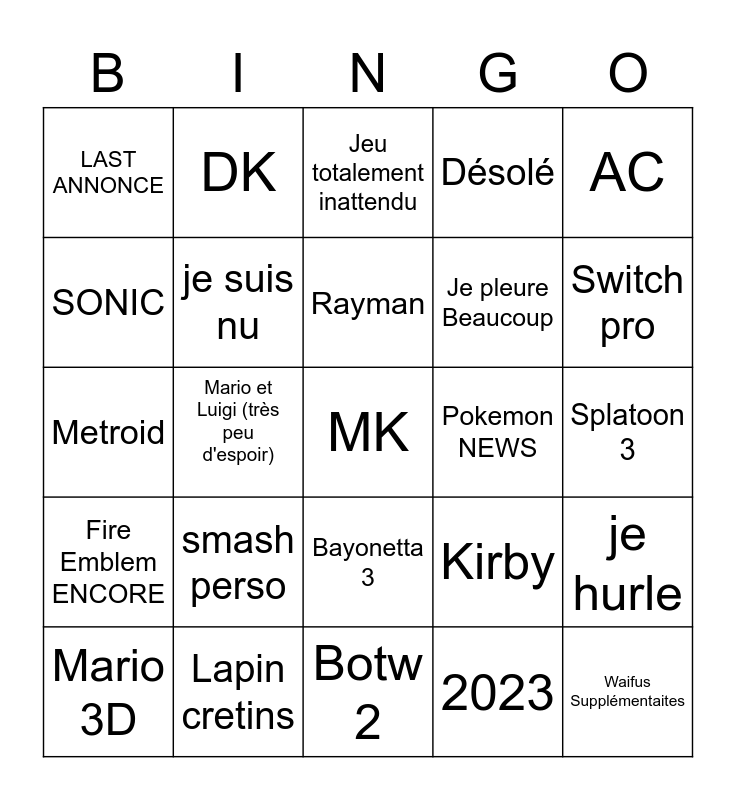 This bingo card has a free space and 24 words: smash perso, Lapin cretins, Rayman, Mario 3D, AC, LAST ANNONCE, SONIC, DK, Pokemon NEWS, Bayonetta 3, Je pleure Beaucoup, Metroid, Kirby, je hurle, je suis nu, 2023, Splatoon 3, Jeu totalement inattendu, Switch pro, Mario et Luigi (très peu d'espoir), Waifus Supplémentaites, Fire Emblem ENCORE, Désolé and Botw 2.