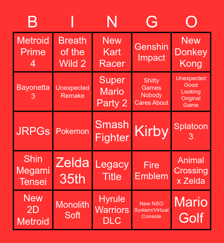 This bingo card has a free space and 24 words: Zelda 35th, Monolith Soft, Super Mario Party 2, New 2D Metroid, New Donkey Kong, Metroid Prime 4, Bayonetta 3, Breath of the Wild 2, Kirby, Legacy Title, Shitty Games Nobody Cares About, JRPGs, Fire Emblem, Animal Crossing x Zelda, Unexpected Remake, New NSO System/Virtual Console, Splatoon 3, New Kart Racer, Unexpected Good Looking Original Game, Pokemon, Mario Golf, Shin Megami Tensei, Genshin Impact and Hyrule Warriors DLC.