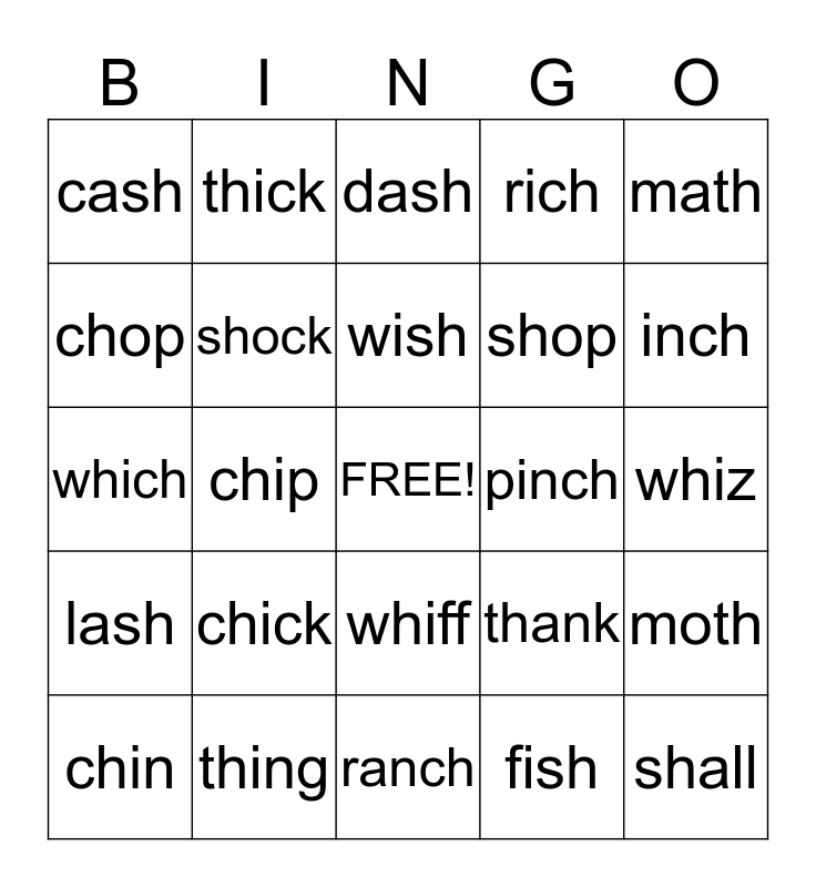 This bingo card has a free space and 24 words: chick, thing, wish, chin, math, cash, chop, thick, pinch, whiff, shop, which, thank, moth, shock, fish, whiz, dash, inch, chip, shall, lash, rich and ranch.