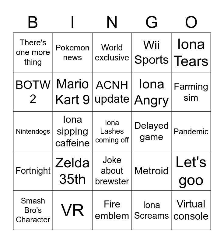 This bingo card has a free space and 24 words: Zelda 35th, VR, ACNH update, Smash Bro's Character, Iona Tears, There's one more thing, BOTW 2, Pokemon news, Delayed game, Joke about brewster, Iona Angry, Nintendogs, Metroid, Let's goo, Mario Kart 9, Iona Screams, Pandemic, World exclusive, Farming sim, Iona sipping caffeine, Virtual console, Fortnight, Wii Sports and Fire emblem.