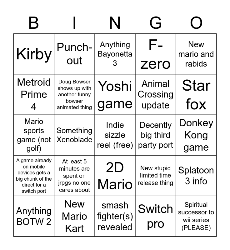 This bingo card has a free space and 24 words: At least 5 minutes are spent on jrpgs no one cares about, New Mario Kart, Yoshi game, Anything BOTW 2, New mario and rabids, Kirby, Metroid Prime 4, Punch-out, Decently big third party port, 2D Mario, Animal Crossing update, Mario sports game (not golf), New stupid limited time release thing, Splatoon 3 info, Doug Bowser shows up with another funny bowser animated thing, Switch pro, Donkey Kong game, Anything Bayonetta 3, Star fox, Something Xenoblade, Spiritual successor to wii series (PLEASE), A game already on mobile devices gets a big chunk of the direct for a switch port, F-zero and smash fighter(s) revealed.