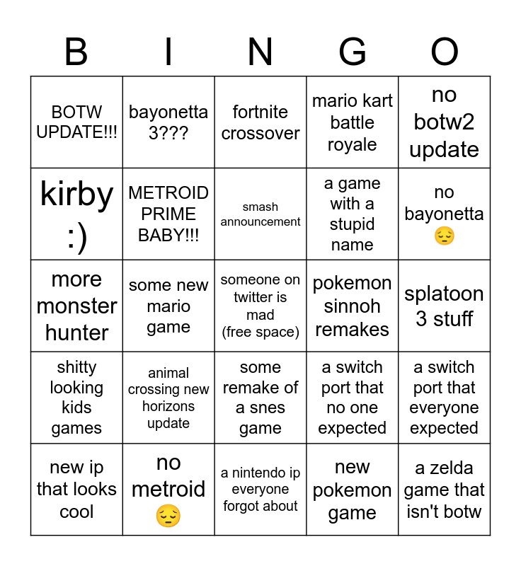 This bingo card has a free space and 24 words: animal crossing new horizons update, no metroid 😔, smash announcement, new ip that looks cool, no botw2 update, BOTW UPDATE!!!, kirby :), bayonetta 3???, pokemon sinnoh remakes, some remake of a snes game, a game with a stupid name, more monster hunter, a switch port that no one expected, a switch port that everyone expected, METROID PRIME BABY!!!, new pokemon game, splatoon 3 stuff, fortnite crossover, no bayonetta 😔, some new mario game, a zelda game that isn't botw, shitty looking kids games, mario kart battle royale and a nintendo ip everyone forgot about.