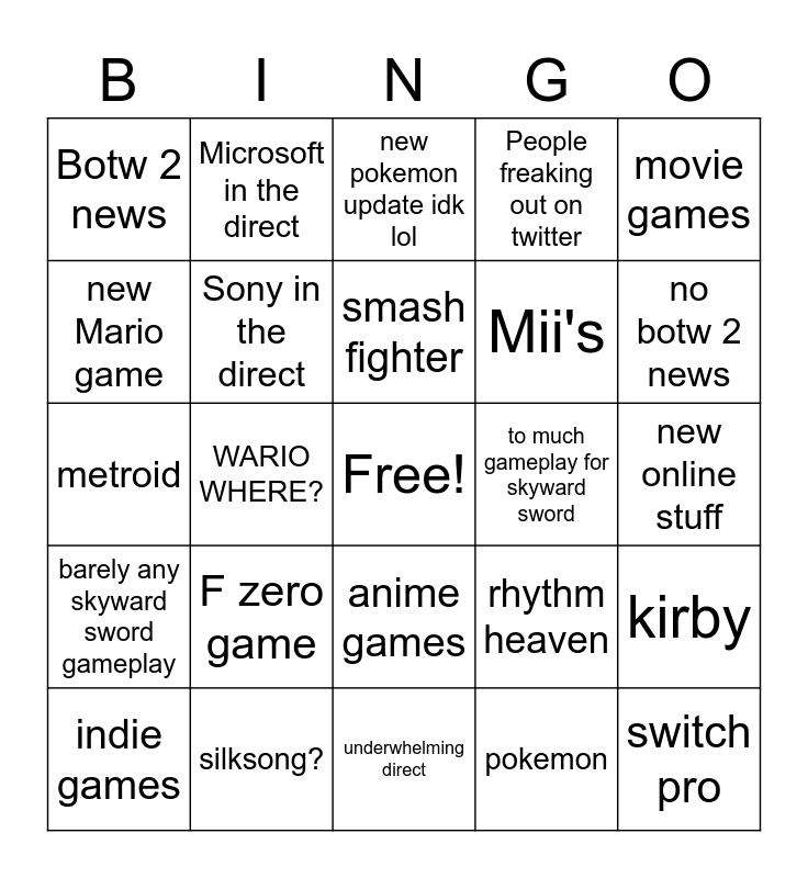 This bingo card has a free space and 24 words: F zero game, silksong?, smash fighter, indie games, movie games, Botw 2 news, new Mario game, Microsoft in the direct, to much gameplay for skyward sword, anime games, Mii's, metroid, rhythm heaven, kirby, Sony in the direct, pokemon, new online stuff, new pokemon update idk lol, no botw 2 news, WARIO WHERE?, switch pro, barely any skyward sword gameplay, People freaking out on twitter and underwhelming direct.