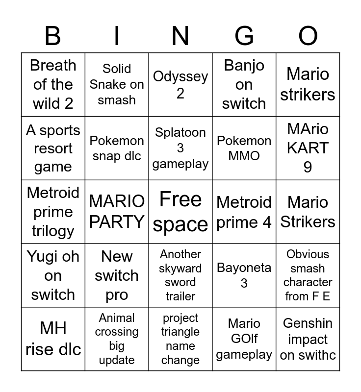 This bingo card has a free space and 24 words: New switch pro, Animal crossing big update, Splatoon 3 gameplay, MH rise dlc, Mario strikers, Breath of the wild 2, A sports resort game, Solid Snake on smash, Metroid prime 4, Another skyward sword trailer, Pokemon MMO, Metroid prime trilogy, Bayoneta 3, Obvious smash character from F E, Pokemon snap dlc, Mario GOlf gameplay, Mario Strikers, Odyssey 2, MArio KART 9, MARIO PARTY, Genshin impact on swithc, Yugi oh on switch, Banjo on switch and project triangle name change.