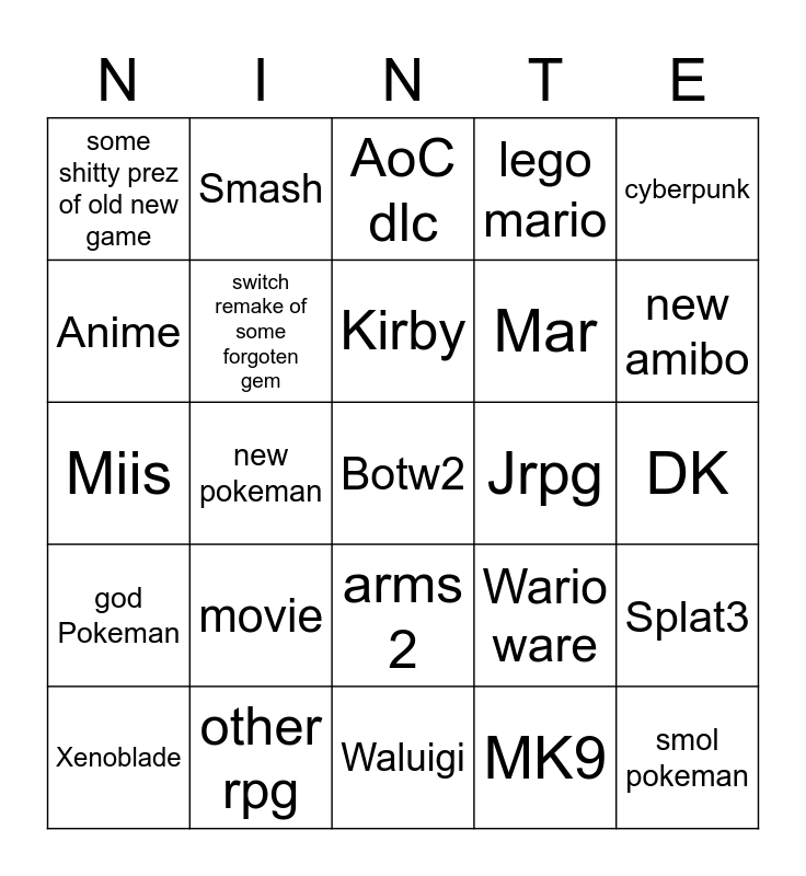 This bingo card has a free space and 24 words: movie, other rpg, Kirby, Xenoblade, cyberpunk, some shitty prez of old new game, Anime, Smash, Jrpg, arms 2, Mar, Miis, Wario ware, Splat3, switch remake of some forgoten gem, MK9, DK, AoC dlc, new amibo, new pokeman, smol pokeman, god Pokeman, lego mario and Waluigi.