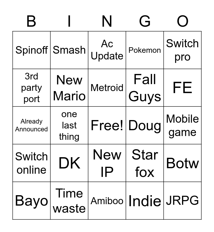 This bingo card has a free space and 24 words: DK, Time waste, Metroid, Bayo, Switch pro, Spinoff, 3rd party port, Smash, Doug, New IP, Fall Guys, Already Announced, Star fox, Botw, New Mario, Indie, Mobile game, Ac Update, FE, one last thing, JRPG, Switch online, Pokemon and Amiboo.