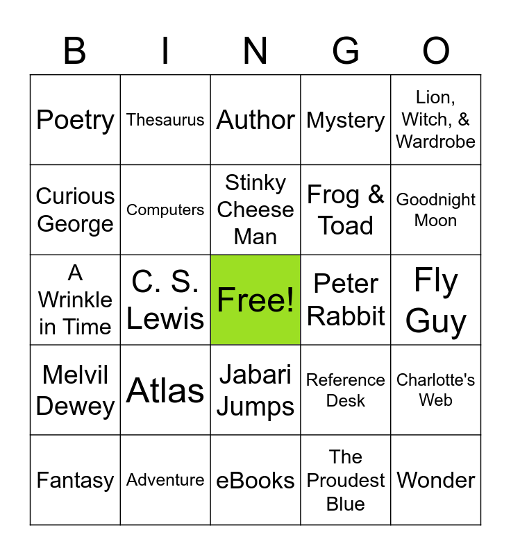 This bingo card has a free space and 24 words: Fantasy, Atlas, Stinky Cheese Man, The Proudest Blue, Lion, Witch, & Wardrobe, Poetry, Thesaurus, Author, Peter Rabbit, Fly Guy, A Wrinkle in Time, Computers, Reference Desk, Charlotte's Web, Curious George, Adventure, eBooks, Mystery, Goodnight Moon, Melvil Dewey, C. S. Lewis, Jabari Jumps, Frog & Toad and Wonder.