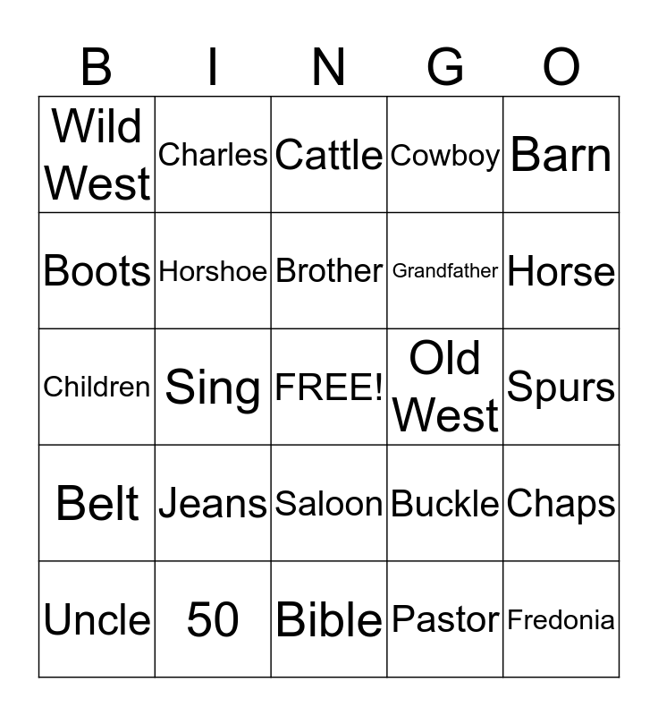 This bingo card has a free space and 24 words: Jeans, 50, Brother, Uncle, Barn, Wild West, Boots, Charles, Old West, Saloon, Grandfather, Children, Buckle, Chaps, Horshoe, Pastor, Spurs, Cattle, Horse, Sing, Fredonia, Belt, Cowboy and Bible.
