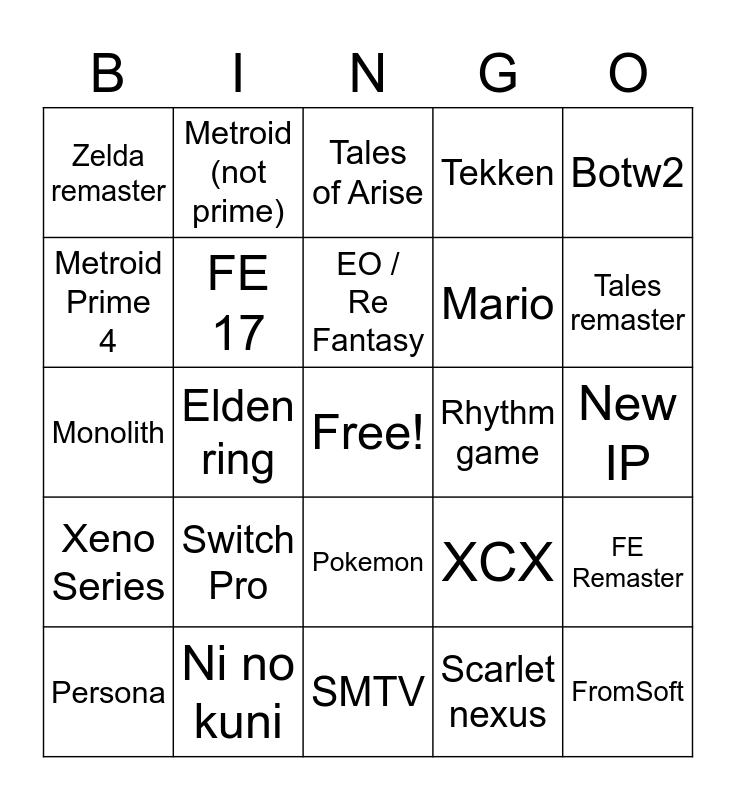 This bingo card has a free space and 25 words: Switch Pro, SMTV, EO / Re Fantasy, Persona, Botw2, Zelda remaster, Metroid Prime 4, Metroid (not prime), Rhythm game, Pokemon, Mario, Monolith, XCX, FE Remaster, FE 17, Mother, New IP, Tales of Arise, Tales remaster, Elden ring, FromSoft, Ni no kuni, Xeno Series, Tekken and Scarlet nexus.