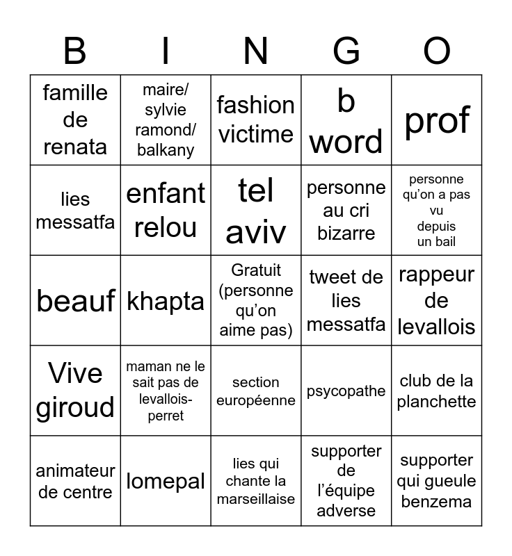 This bingo card has a free space and 24 words: maman ne le sait pas de levallois-perret, lomepal, tel aviv, animateur de centre, prof, famille de renata, lies messatfa, maire/ sylvie ramond/ balkany, tweet de lies messatfa, section européenne, personne au cri bizarre, beauf, psycopathe, club de la planchette, enfant relou, supporter de l’équipe adverse, rappeur de levallois, fashion victime, personne qu’on a pas vu depuis un bail, khapta, supporter qui gueule benzema, Vive giroud, b word and lies qui chante la marseillaise.