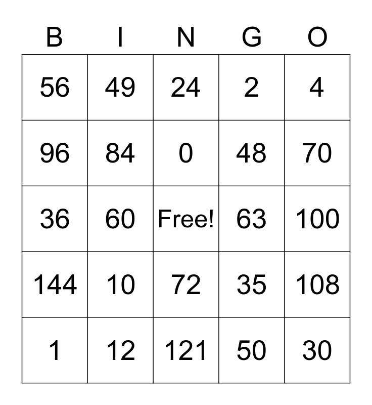 This bingo card has a free space and 24 words: 10, 12, 0, 1, 4, 56, 96, 49, 63, 72, 48, 36, 35, 108, 84, 50, 100, 24, 70, 60, 30, 144, 2 and 121.