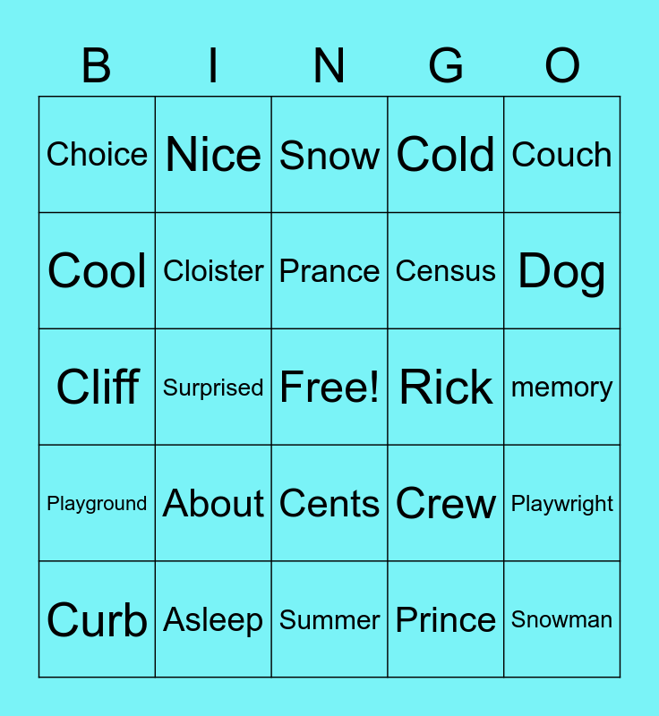 This bingo card has a free space and 24 words: About, Asleep, Prance, Curb, Couch, Choice, Cool, Nice, Rick, Cents, Census, Cliff, Crew, Playwright, Cloister, Prince, memory, Snow, Dog, Surprised, Snowman, Playground, Cold and Summer.