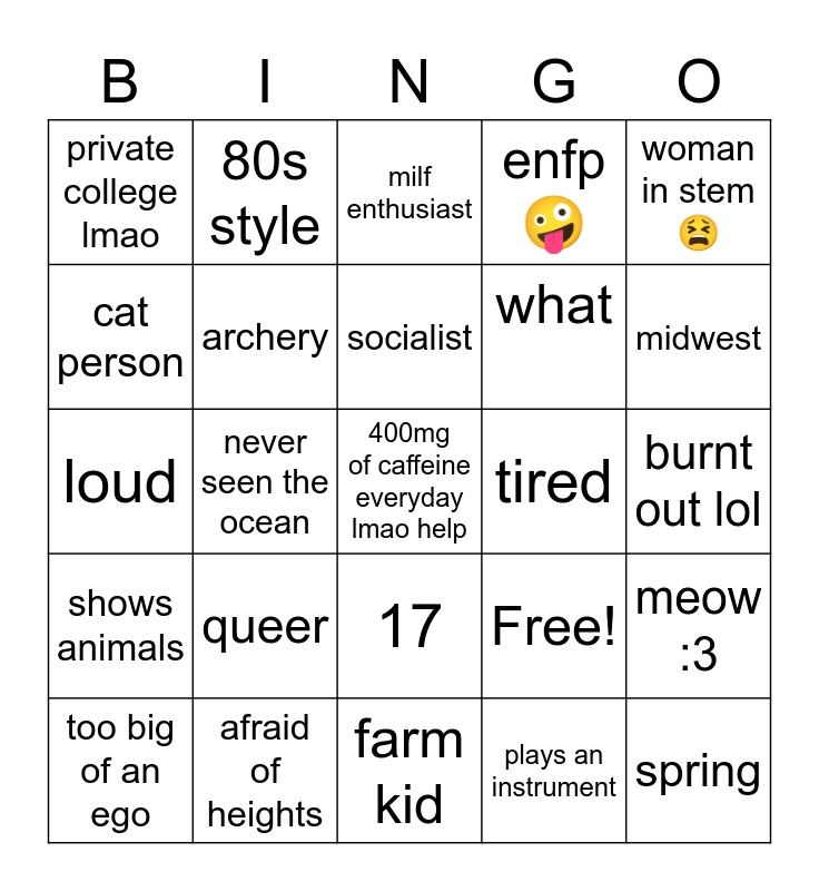 This bingo card has 25 words: queer, farm kid, socialist, too big of an ego, woman in stem 😫, private college lmao, cat person, 80s style, tired, 17, what, loud, Free!, meow :3, archery, spring, burnt out lol, milf enthusiast, midwest, never seen the ocean, 400mg of caffeine everyday lmao help, afraid of heights, shows animals, enfp 🤪 and plays an instrument.
