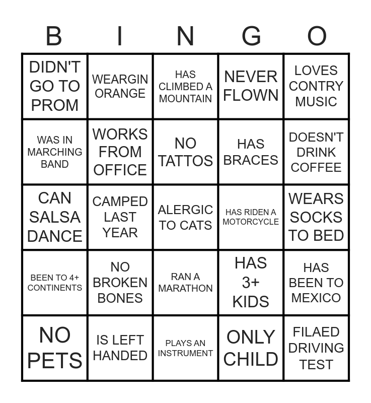 This bingo card has 25 words: NO BROKEN BONES, PLAYS AN INSTRUMENT, NO TATTOS, NO PETS, LOVES CONTRY MUSIC, DIDN'T GO TO PROM, WAS IN MARCHING BAND, WEARGIN ORANGE, HAS RIDEN A MOTORCYCLE, RAN A MARATHON, HAS BRACES, CAN SALSA DANCE, HAS 3+ KIDS, HAS BEEN TO MEXICO, WORKS FROM OFFICE, FILAED DRIVING TEST, WEARS SOCKS TO BED, HAS CLIMBED A MOUNTAIN, DOESN'T DRINK COFFEE, CAMPED LAST YEAR, ALERGIC TO CATS, IS LEFT HANDED, BEEN TO 4+ CONTINENTS, NEVER FLOWN and ONLY CHILD.