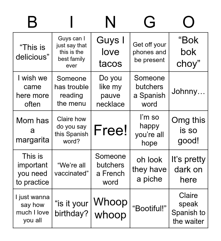 This bingo card has a free space and 24 words: “We’re all vaccinated”, “is it your birthday?, Do you like my pauve necklace, I just wanna say how much I love you all, “Bok bok choy”, “This is delicious”, I wish we came here more often, Guys can I just say that this is the best family ever, I’m so happy you’re all hope, Someone butchers a French word, Someone butchers a Spanish word, Mom has a margarita, oh look they have a piche, It’s pretty dark on here, Someone has trouble reading the menu, “Bootiful!”, Omg this is so good!, Guys I love tacos, Johnny…, Claire how do you say this Spanish word?, Claire speak Spanish to the waiter, This is important you need to practice, Get off your phones and be present and Whoop whoop.