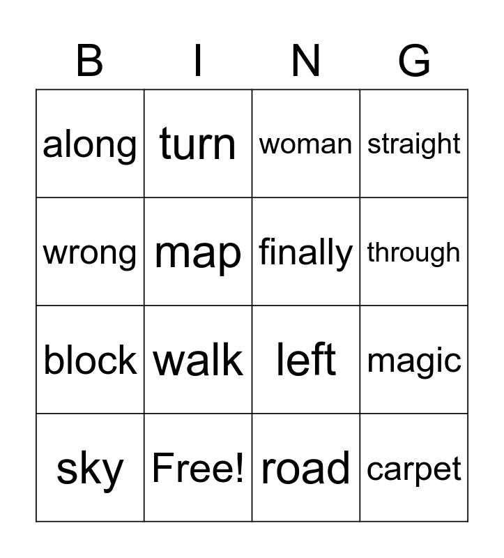 This bingo card has 16 words: Free!, magic, woman, along, block, turn, left, road, wrong, map, sky, straight, walk, through, finally and carpet.
