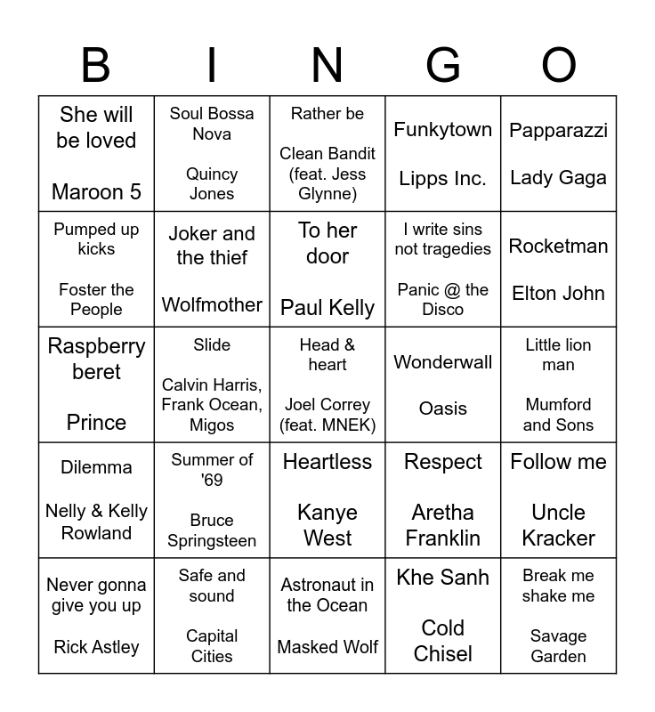 This bingo card has 25 words: Summer of '69 Bruce Springsteen, Astronaut in the Ocean Masked Wolf, To her door Paul Kelly, Never gonna give you up Rick Astley, Papparazzi Lady Gaga, She will be loved Maroon 5, Pumped up kicks Foster the People, Soul Bossa Nova Quincy Jones, Wonderwall Oasis, Heartless Kanye West, I write sins not tragedies Panic @ the Disco, Raspberry beret Prince, Respect Aretha Franklin, Follow me Uncle Kracker, Joker and the thief Wolfmother, Break me shake me Savage Garden, Little lion man Mumford and Sons, Rather be Clean Bandit (feat. Jess Glynne), Rocketman Elton John, Slide Calvin Harris, Frank Ocean, Migos, Head & heart Joel Correy (feat. MNEK), Safe and sound Capital Cities, Dilemma Nelly & Kelly Rowland, Funkytown Lipps Inc. and Khe Sanh Cold Chisel.