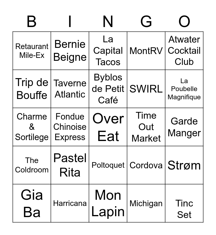 This bingo card has a free space and 24 words: Pastel Rita, Harricana, Byblos de Petit Café, Gia Ba, Atwater Cocktail Club, Retaurant Mile-Ex, Trip de Bouffe, Bernie Beigne, Time Out Market, Poltoquet, SWIRL, Charme & Sortilege, Cordova, Strøm, Taverne Atlantic, Michigan, Garde Manger, La Capital Tacos, La Poubelle Magnifique, Fondue Chinoise Express, Tinc Set, The Coldroom, MontRV and Mon Lapin.