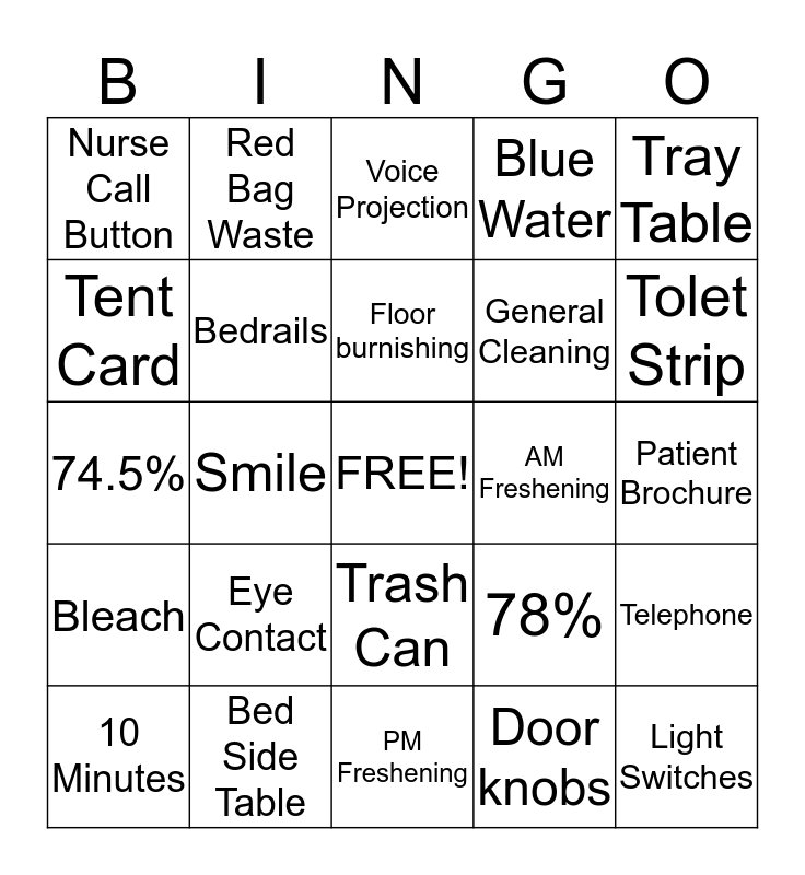 This bingo card has a free space and 24 words: Eye Contact, Bed Side Table, Floor burnishing, 10 Minutes, Tray Table, Nurse Call Button, Tent Card, Red Bag Waste, AM Freshening, Trash Can, General Cleaning, 74.5%, 78%, Telephone, Bedrails, Door knobs, Patient Brochure, Voice Projection, Tolet Strip, Smile, Light Switches, Bleach, Blue Water and PM Freshening.
