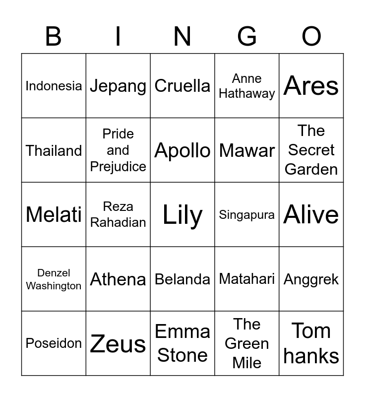 This bingo card has a free space and 24 words: Athena, Zeus, Apollo, Poseidon, Ares, Indonesia, Thailand, Jepang, Singapura, Belanda, Mawar, Melati, Matahari, Anggrek, Pride and Prejudice, The Green Mile, Alive, Cruella, The Secret Garden, Reza Rahadian, Tom hanks, Denzel Washington, Anne Hathaway and Emma Stone.