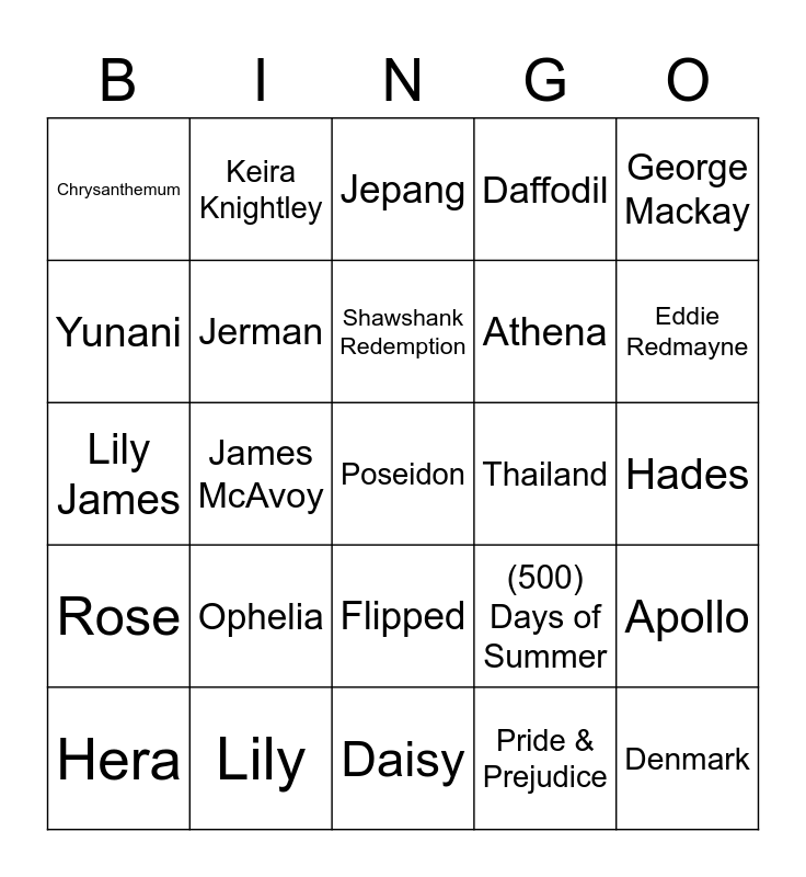 This bingo card has a free space and 24 words: Ophelia, Lily, Shawshank Redemption, Hera, George Mackay, Chrysanthemum, Yunani, Keira Knightley, Thailand, Flipped, Athena, Lily James, (500) Days of Summer, Apollo, Jerman, Pride & Prejudice, Hades, Jepang, Eddie Redmayne, James McAvoy, Denmark, Rose, Daffodil and Daisy.