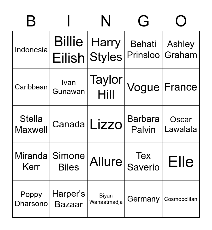 This bingo card has a free space and 24 words: Simone Biles, Harper's Bazaar, Taylor Hill, Poppy Dharsono, Ashley Graham, Indonesia, Caribbean, Billie Eilish, Barbara Palvin, Allure, Vogue, Stella Maxwell, Tex Saverio, Elle, Ivan Gunawan, Germany, Oscar Lawalata, Harry Styles, France, Canada, Cosmopolitan, Miranda Kerr, Behati Prinsloo and Biyan Wanaatmadja.