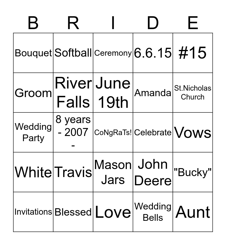 This bingo card has a free space and 39 words: Newlywed, Farmer, Sangria, River Falls, Invitations, Mason Jars, June 19th, Brother, #15, White, 8 years - 2007 -, 6.6.15, Aunt, Vows, Celebrate, Travis, Dress, Bouquet, Sister, John Deere, Groom, Love, Amanda, St.Nicholas Church, Rock Hard Landscape, Park Ballroom, Flowers, Rings, Honeymoon, Softball, August 24th, Basketball Coach, Ceremony, Blessed, Wedding Bells, Happy Holstein Dairy, "Bucky", Wedding Party and St.Cloud State University.
