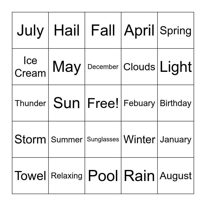 This bingo card has a free space and 24 words: Summer, Relaxing, December, Towel, Spring, July, Ice Cream, Hail, Febuary, Sunglasses, Clouds, Thunder, Winter, January, May, Rain, Birthday, Fall, Light, Sun, August, Storm, April and Pool.