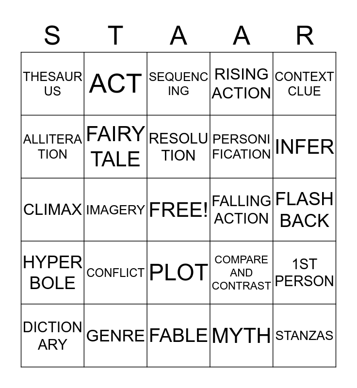 This bingo card has a free space and 24 words: CONFLICT, GENRE, RESOLU TION, DICTION ARY, CONTEXT CLUE, THESAUR US, ALLITERA TION, ACT, FALLING ACTION, PLOT, PERSONI FICATION, CLIMAX, COMPARE AND CONTRAST, 1ST PERSON, FAIRY TALE, MYTH, FLASH BACK, SEQUENC ING, INFER, IMAGERY, STANZAS, HYPER BOLE, RISING ACTION and FABLE.