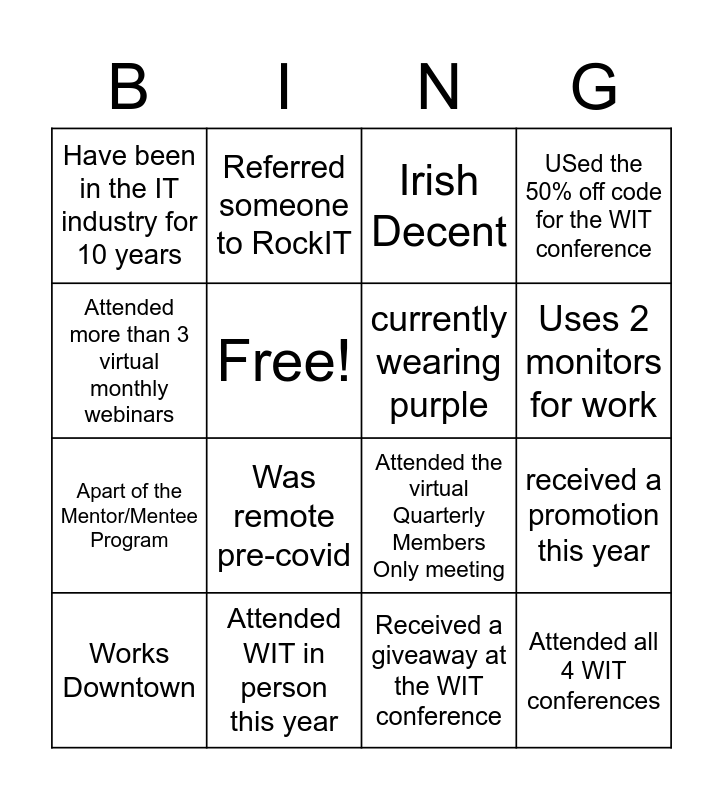 This bingo card has 16 words: Attended WIT in person this year, received a promotion this year, Irish Decent, Have been in the IT industry for 10 years, Apart of the Mentor/Mentee Program, Referred someone to RockIT, Attended the virtual Quarterly Members Only meeting, Received a giveaway at the WIT conference, Attended more than 3 virtual monthly webinars, Free!, Works Downtown, USed the 50% off code for the WIT conference, Was remote pre-covid, Uses 2 monitors for work, currently wearing purple and Attended all 4 WIT conferences.