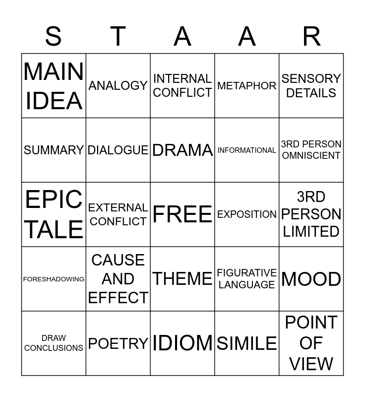 This bingo card has a free space and 24 words: CAUSE AND EFFECT, POETRY, DRAMA, DRAW CONCLUSIONS, SENSORY DETAILS, MAIN IDEA, SUMMARY, ANALOGY, EXPOSITION, THEME, INFORMATIONAL, EPIC TALE, FIGURATIVE LANGUAGE, MOOD, DIALOGUE, SIMILE, 3RD PERSON LIMITED, INTERNAL CONFLICT, 3RD PERSON OMNISCIENT, EXTERNAL CONFLICT, POINT OF VIEW, FORESHADOWING, METAPHOR and IDIOM.